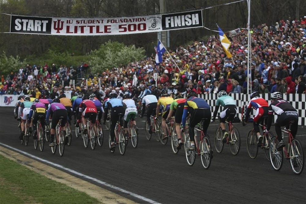Riders of the 2011 men's Little 500 cross the start/finish line Saturday at Bill Armstrong Stadium. Mark Felix