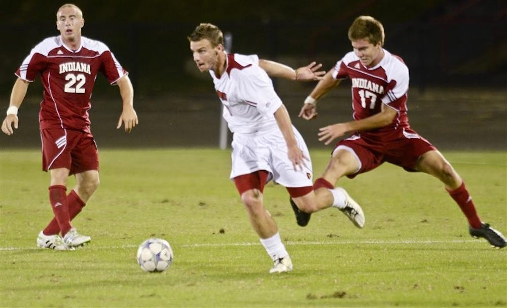 Sophomore midfielder Jacob Bushue attempts to prevent Louisville from moving further with the ball during the first half of the IU vs. Louisville game Wednesday at Bill Armstrong Stadium. Steph Langan