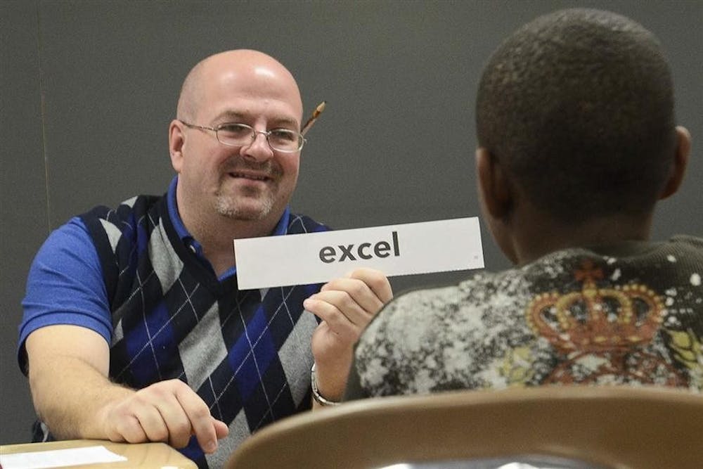Kraig Bushey smiles as he holds up a vocabulary flashcard to Lamar and asks the students to use the word in a sentence. Steph Langan