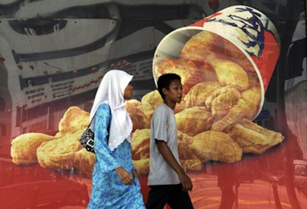 Malaysian people walk past a fast food ad billboard in downtown Kuala Lumpur, Malaysia, Monday. Malaysian authorities may ban fast food advertisements on children's television shows to help curb obesity and diet-linked diseases, the health minister said Monday. (AP Photo/Vincent Thian)