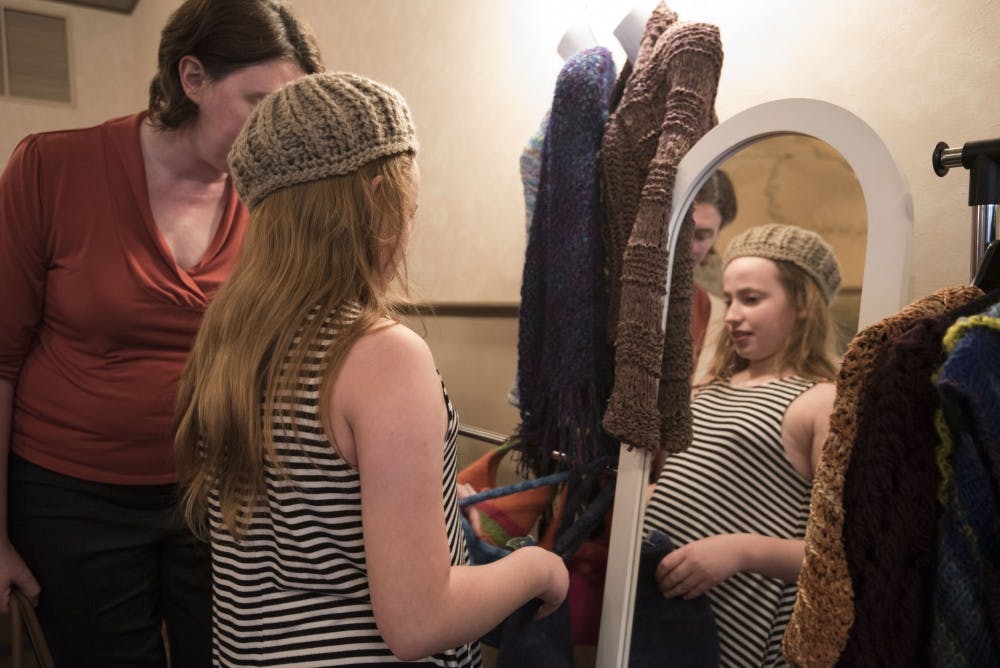 Victoria Laudemen and her daughter Lilly look at knitted shawls and hats for sale at the Wrapped in Love event on Sunday. The event in the Fountain Square Ballroom benefitted Middle Way House.