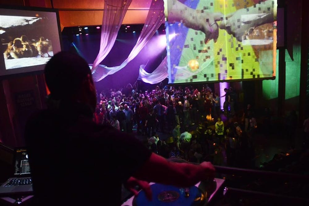 DJ Action Jackson spins records as he plays music for the LGBTQ dance party Saturday at the Buskirk-Chumley Theater.