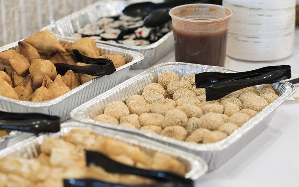 Dozens of different traditional Asian and Pacific Islander foods line the buffet table at the Asian Cultural Center's first event for Asian and Pacific Islander Heritage Month. This year's theme is "Belonging," and Chinese filmaker Popo Fan spoke at the event while attendees ate food and looked at different books and art displayed around the room.