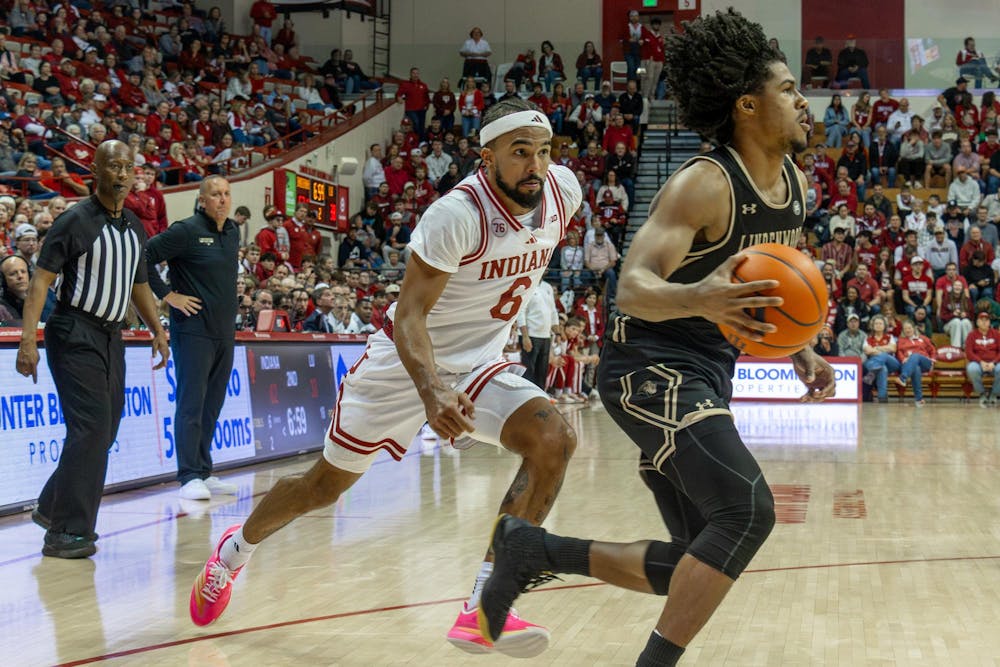 Sixth-year senior guard Tayton Conerway runs toward a Lindenwood University player on Nov. 20, 2025, at Simon Skjodt Assembly Hall in Bloomington. Conerway scored 18 points in the Hoosiers' loss to Minnesota on Wednesday. Briana Pace