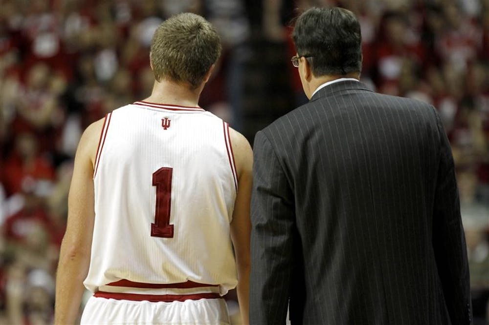 Jordan Hulls and Tom Crean talk during IU's game against No. 1 Kentucky at Assembly Hall. Mark Felix
