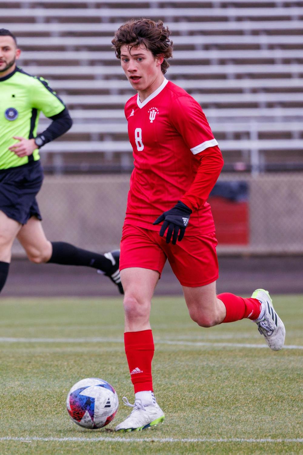 Sophomore midfielder Seth Stewart dribbles the ball into the open field against the University of Evansville on Feb. 24, 2024, at Bill Armstrong Stadium in Bloomington. Stewart didn't play at all during the 2023 regular season.