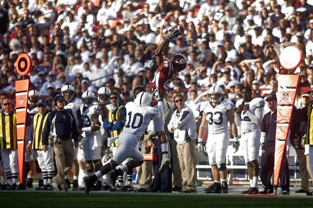 Junior wide receiver Damarlo Belcher makes a catch on the sidelines during IU's 41-24 loss to Penn State on Saturday at Fedex Field in Landover, Md. Peter Stevenson