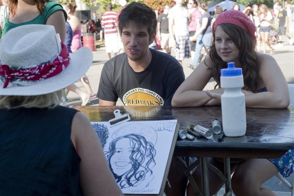 Juniors Alex Petkov (left) and Molly Sanford sit as their caricatures are drawn at CultureFest on Thursday at Showalter Fountain.