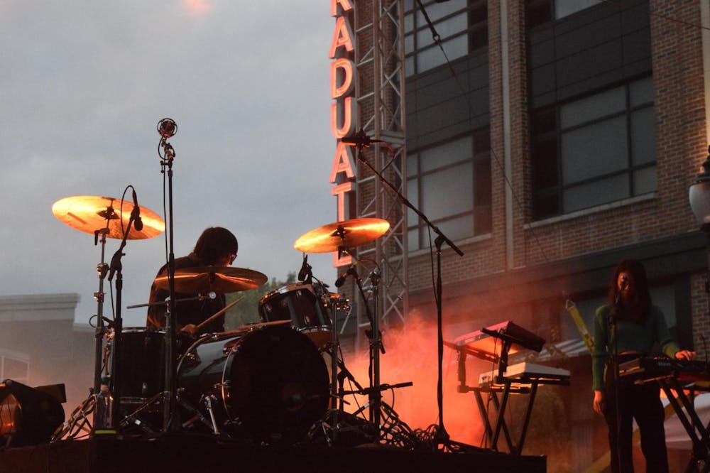 The backup instrument players for Sleater-Kinney are seen on the main stage of the Granfalloon Festival on June 8, 2024, on Kirkwood Avenue in Bloomington.The festival began in 2018. IDS file photo