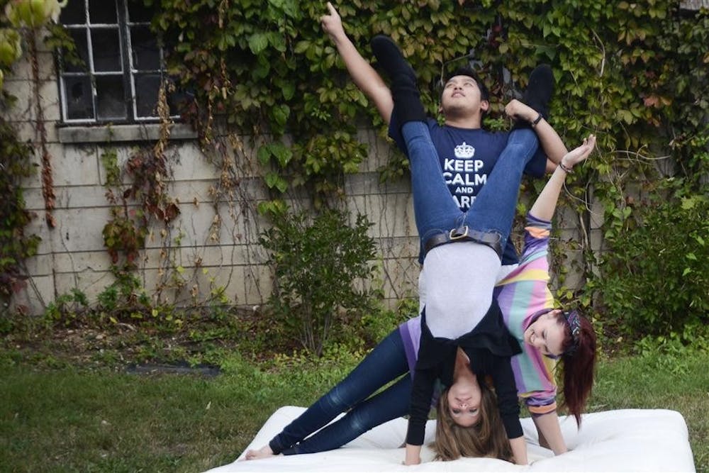 Sophomore Nero Manalo and freshmen Molly Jiraseu and Ashley Minyard create a human statue Friday at the Friends of Art Block Party in downtown Bloomington. Competitions were held for who could make the best statue throughout the night.