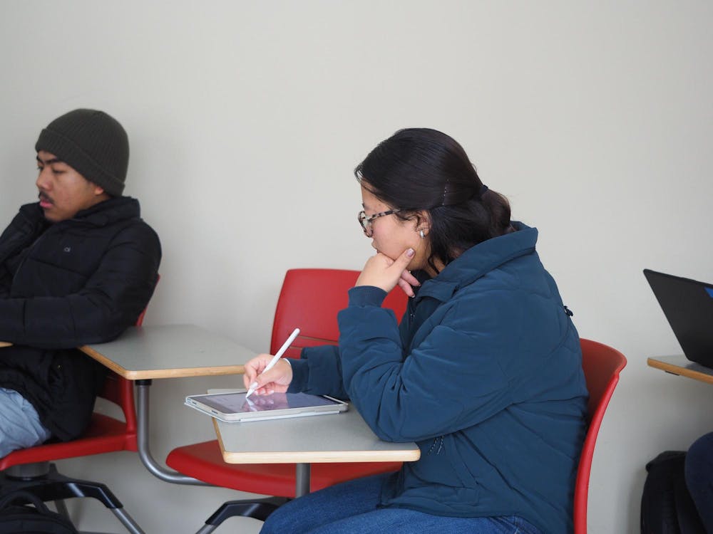 A student takes notes at an intermediate Burmese class Dec. 3, 2025, in Ballantine Hall in Bloomington. Myat said he uses voice recordings of people from home to demonstrate Burmese pronunciation to his students and integrates cultural context into his syllabus.