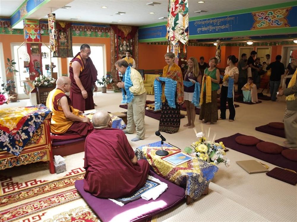 Attendees present khatas, traditional Tibetan Buddhist scarves, to the Drepung Tripa of the Drepung Manstery.