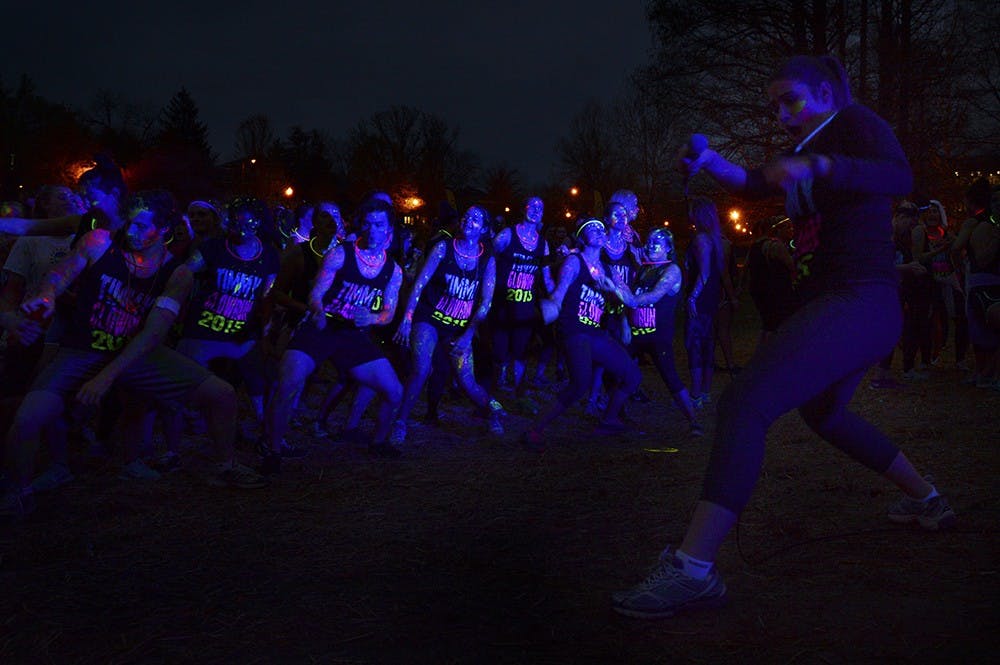 Marlo Owczarza leads a dance during the pre-event party before the Glow Run hosted by Timmy Global Health at Dunn Meadow on Wednesday night. Tiantian Zhang and Tiantian Zhang