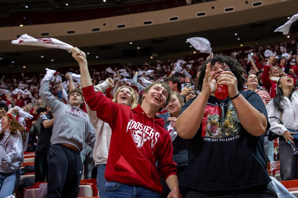 An Indiana fan pumps his fist in the air Jan. 19, 2026, in Simon Skjodt Assembly Hall in Bloomington. He cheered as the Hoosiers got their first touchdown of the game.