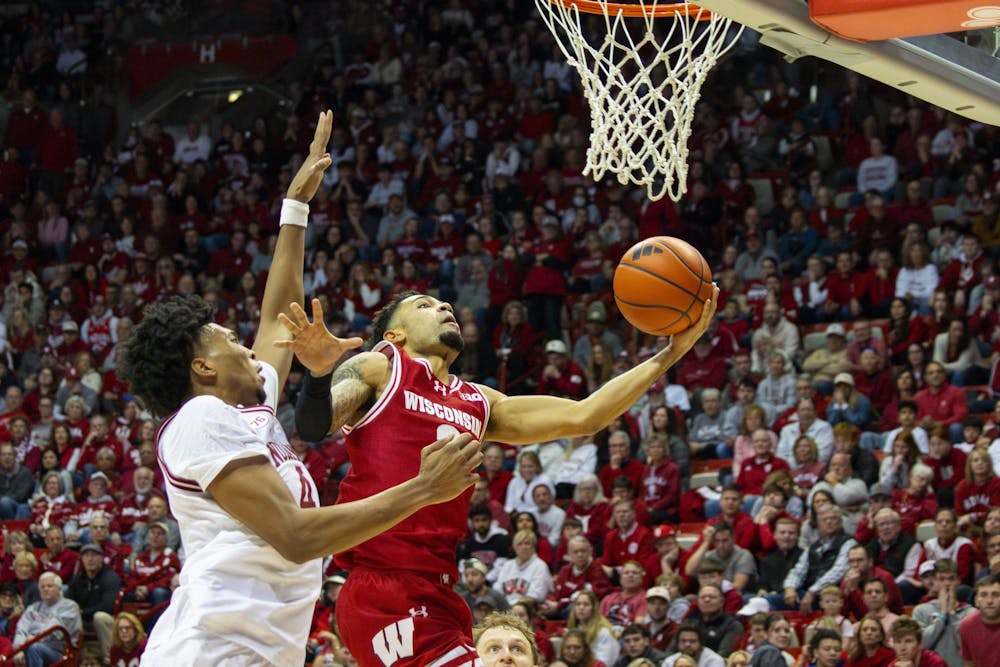 Senior forward Sam Alexis jumps to defend a shot from Wisconsin senior guard Nick Boyd during the game against Wisconsin on Feb. 7, 2026, at Simon Skjodt Assembly Hall in Bloomington. The play resulted in Alexis' only block of the game.