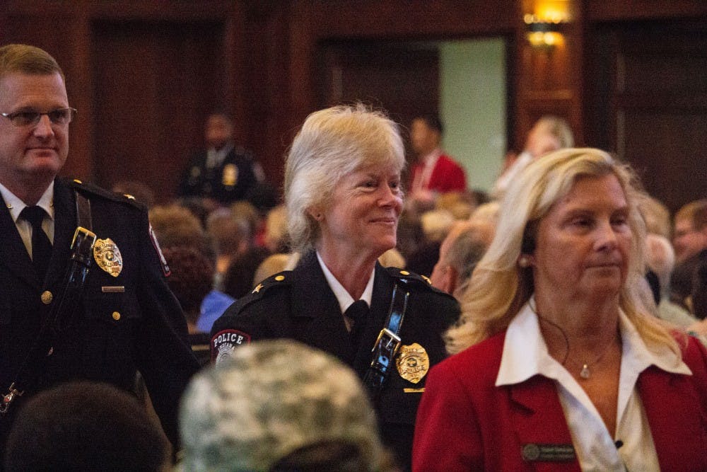 IUPD Chief Laury Flint smiles Aug. 11 at the conclusion of the 45th Indiana University Police Academy graduation ceremony in Alumni Hall in the Indiana Memorial Union. Flint graduated from the IUPA in 1981. Matt Begala