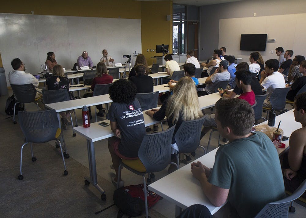 A diverse group of students listen to the panel talk about Islamophobia in the U.S. Pi Lambda Phi set up the event Tuesday in the School of Global and International Studies building to discuss Islamophobia in the United States. Sam Oates