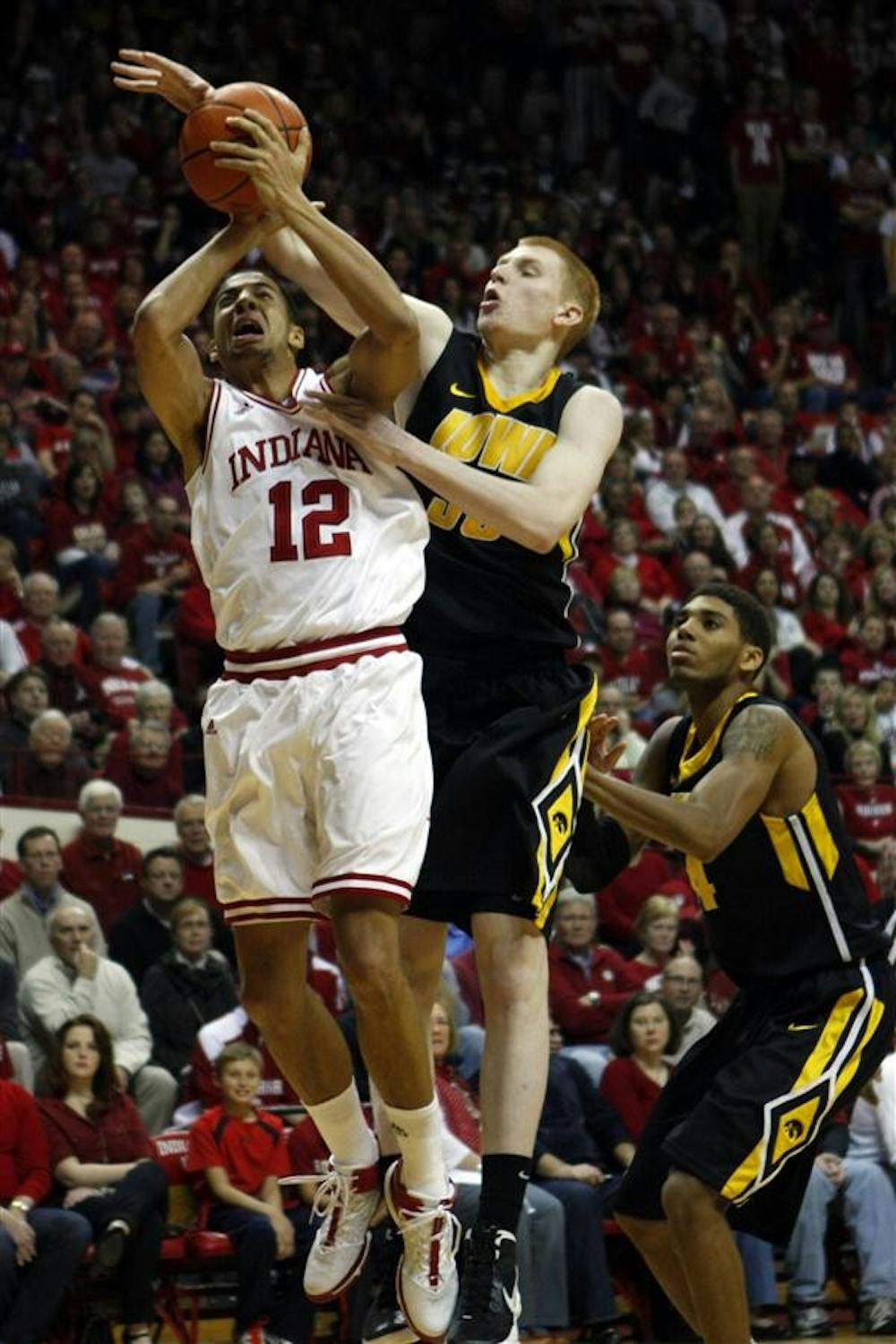 Senior guard Verdell Jones III is fouled by an Iowa defender while going up for a lay-up during IU's 103-89 win Sunday at Assembly Hall. Mark Felix