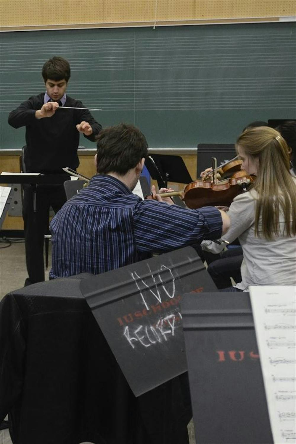 Graduate student Nicholas Hersh conducts the an orchestra during a rehearsal Sunday in the Music Annex. The orchestra will be playing a score written by sophomore Ari Barack Fisher to accompany the film "David Copperfield" on Saturday at the IU Cinema.