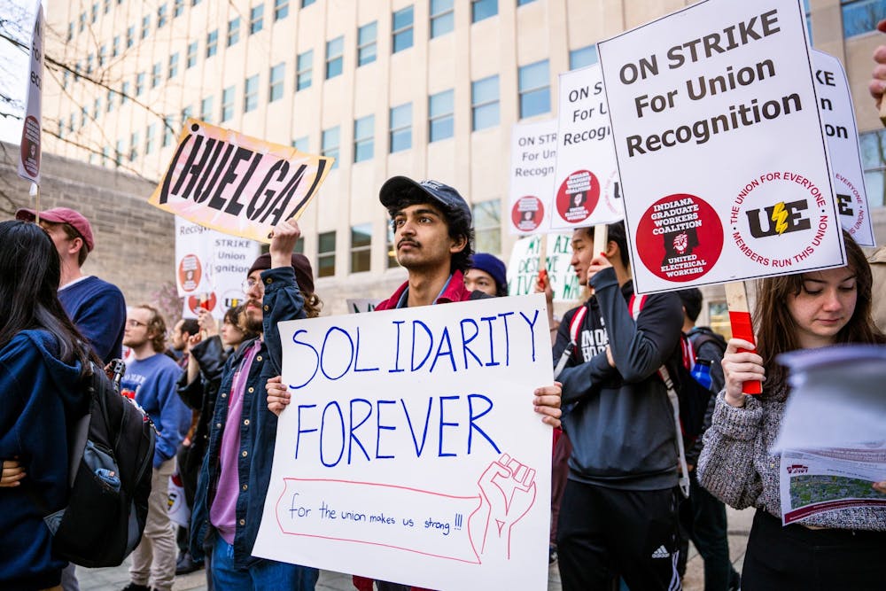 A demonstrator holds a sign April 14, 2022, outside of Ballantine Hall. The Indiana Graduate Workers Coalition-United Electrical Workers strike began Wednesday.