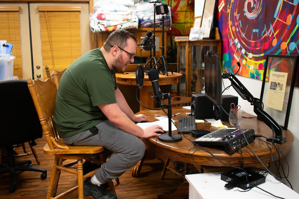 Sam Mitchell leans over his desk as he interviews Leila Farshchian, a behavior analyst, over Zoom on Nov. 19, 2025, at his home in Owensburg, Indiana. He released the podcast episode Nov. 29. Natalia Nelson
