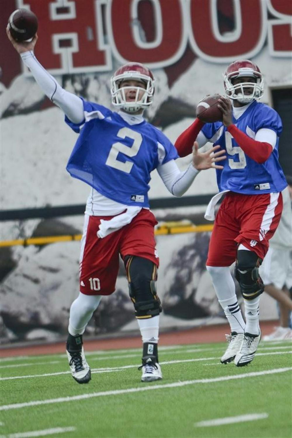 Sophomore quarterback Cameron Coffman and sophomore quarterback Tre Roberson practice making passes Saturday at Assembly Hall. Steph Langan