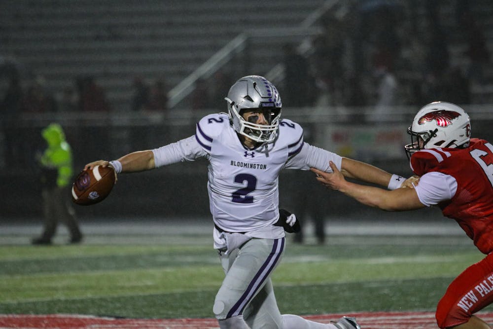 Junior quarterback Duncan Combs stiff-arms a New Palestine High School lineman while looking up field for a receiver during the game on Nov. 21, 2025, at Kelso Stadium in New Palestine, Indiana. The Panthers turned the ball over three times during the game.