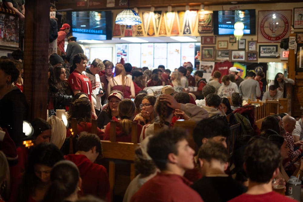 A packed crowd watches the College Football Playoff National Championship Game at 9:42 p.m. Jan. 19, 2026, inside BuffaLouie’s in Bloomington. At halftime, the restaurant was at full capacity.