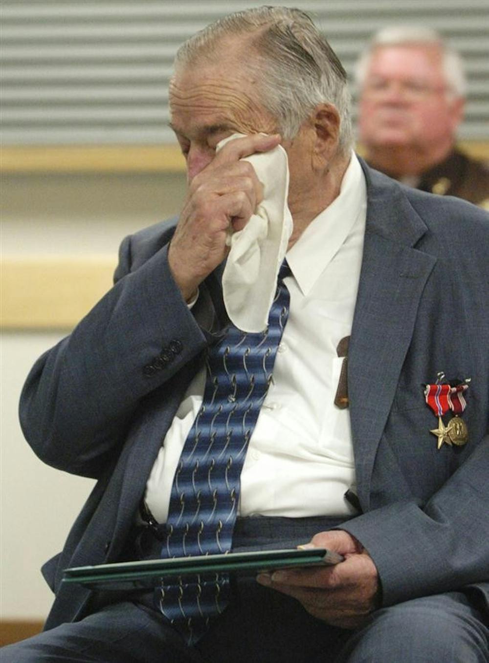 Paul Dotterer wipes a tear from his eye after receiving the Bronze Star Medal and a Good Conduct Medal for his service in the Pacific during World War II Saturday, April 3, 2010 Saturday at the Bluffton American Legion Post 111 in Bluffton, Ind.
