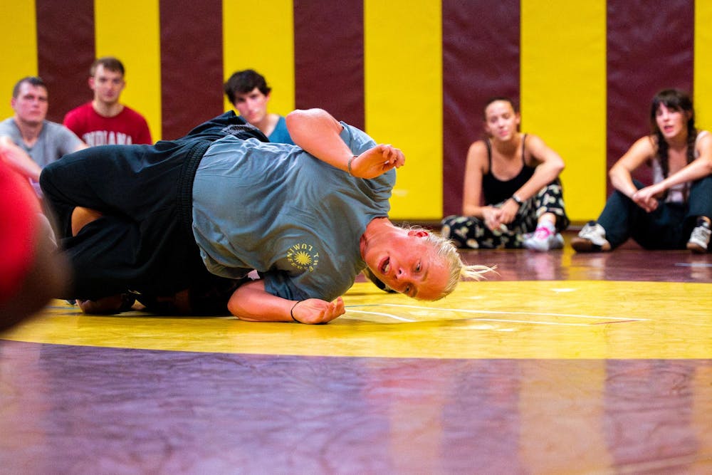 A wrestler demonstrates a move during a team workout Oct. 7, 2025, at Bloomington High School North in Bloomington. The team's first practice of the season was in mid-September. JT Frenzel