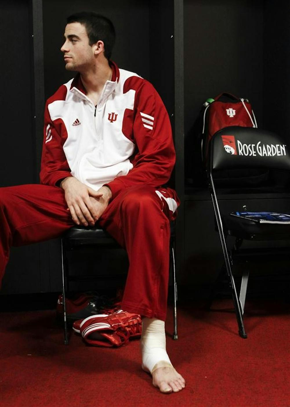 Will Sheehey sits in the locker room prior to open practice on Wednesday. Despite having injured his foot recently, Sheehey will start the next round of the tournament.