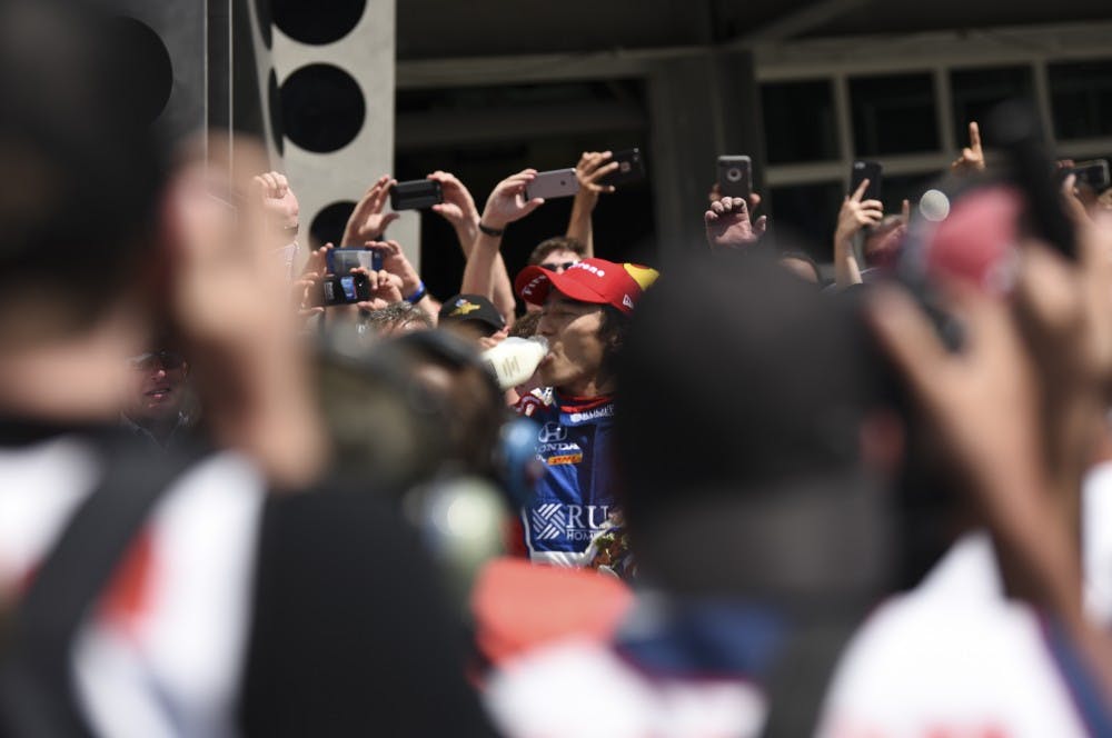 Takuma Sato drinks the ceremonial milk in the winner's circle. Sato won the Indianapolis 500 Sunday afternoon.