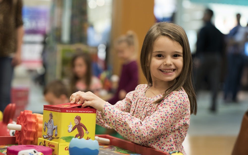 Makenna Warner plays with the Curious George jack-in-the-box at the Toy Chest. The Toy Chest in the college mall held an event Friday night where kids could play with toys and meet Curious George.