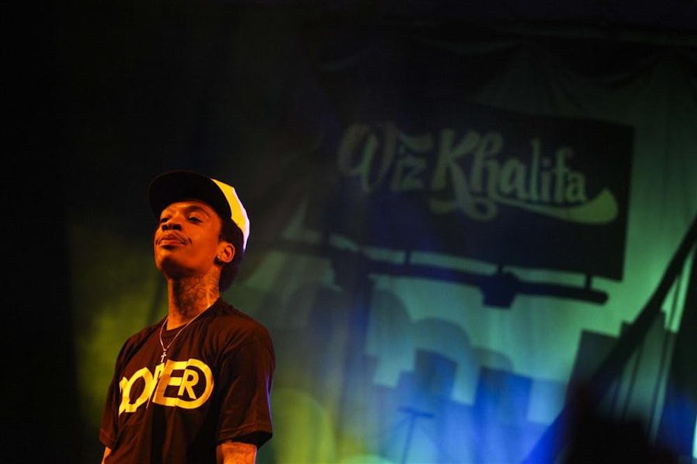 Wiz Khalifa surveys the crowd Friday in the Zeta Beta Tau parking lot. Mark Felix