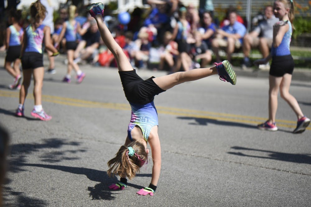 Gymnasts from Bloomington United Gymnastics School do cartwheels and back handsprings down 7th street during the 4th of July parade Tuesday. The school teaches recreational and team gymnastics to preschoolers and up. Rose Bythrow and Rose Bythrow and Rose Bythrow