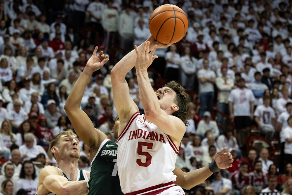 Redshirt senior guard Conor Enright attempts a shot during the game against Michigan State on March 1, 2026, at Simon Skjodt Assembly Hall in Bloomington. Enright made three points for the Hoosiers.