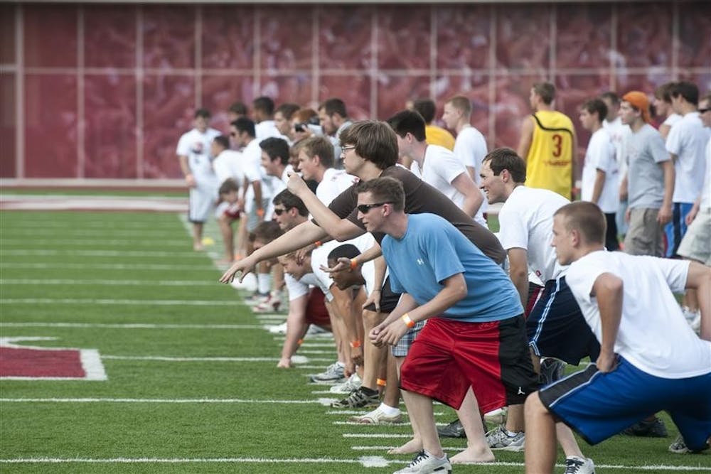 Students line up at the start of IU' s attempt at breaking the record for the world's largest game of dodgeball Sunday at Memorial Stadium. Peter Stevenson
