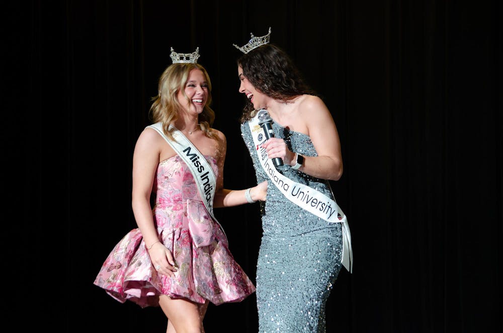 Miss Indiana’s teen Addison Chattin (left) and Miss IU 2025 Alexxys Standish (right) talk on stage during the Miss Indiana University Scholarship Competition on Feb. 15, 2026, in the Willkie Auditorium in Bloomington. Chattin and Standish spoke about their time as titleholders.