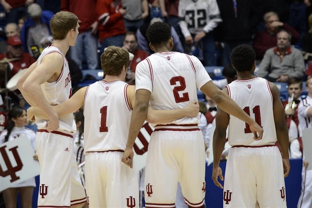 Cody Zeller, Jordan Hulls, Christian Watford and Yogi Ferrel prepare to huddle prior to the start of IU's 83-62 win against James Madison on Friday at the University of Dayton Arena.