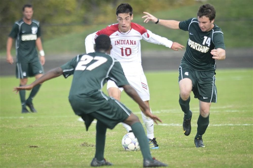 Sophomore midfielder A.J. Corrado fights for the ball during the Hoosiers' 2-2 tie against Michigan State on Sunday at Jerry Yeagley Field.