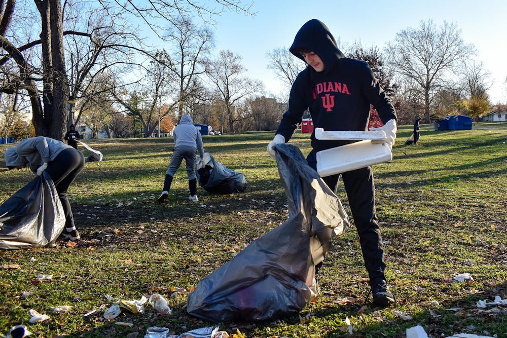 A player stuffs a broken Styrofoam cooler into his trash bag the morning of Nov. 16, 2025, at IU’s tailgate fields. He stomped on the previously intact cooler to break it apart for his bag.