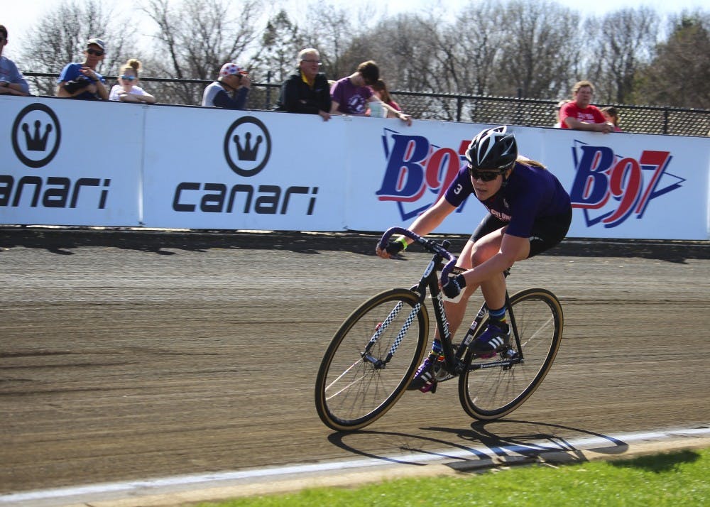 An Alpha Chi Omega cyclist rounds turn 3 during the women’s Little 500 on Friday, April 20, at Bill Armstrong Stadium. Matt Begala