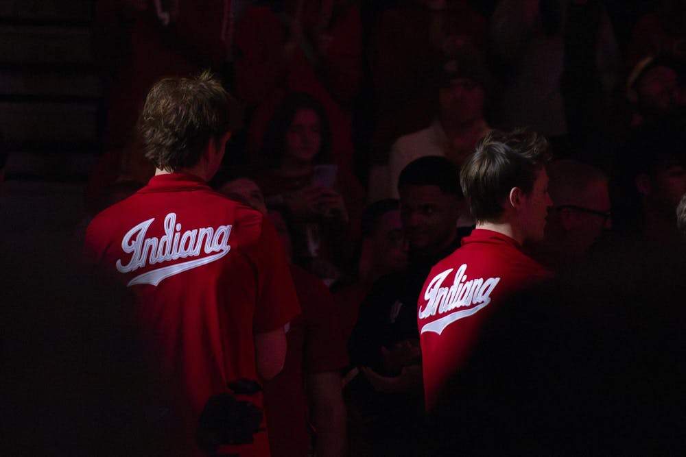 Two Indiana players are pictured during player introductions before the game against Wisconsin on Feb. 7, 2026, at Simon Skjodt Assembly Hall in Bloomington. Indiana won the game in overtime. Jimmy Rush