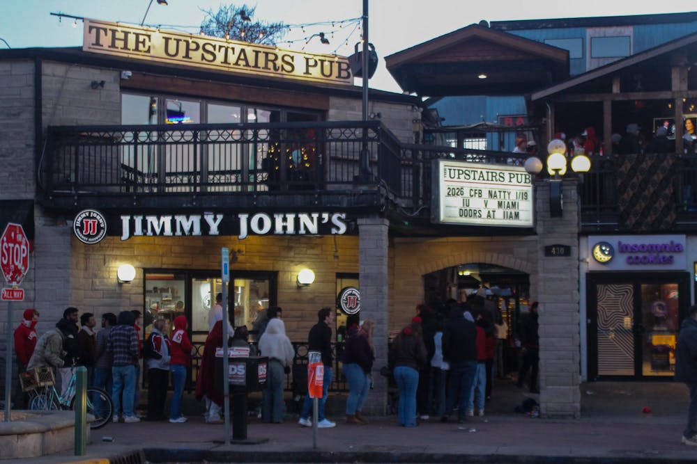 People wait in line two hours before kickoff of the College Football Playoffs National Championship on Jan. 19, 2026, on Kirkwood Avenue in Bloomington. The line for the Upstairs Pub continued to extend as the start of the game approached.