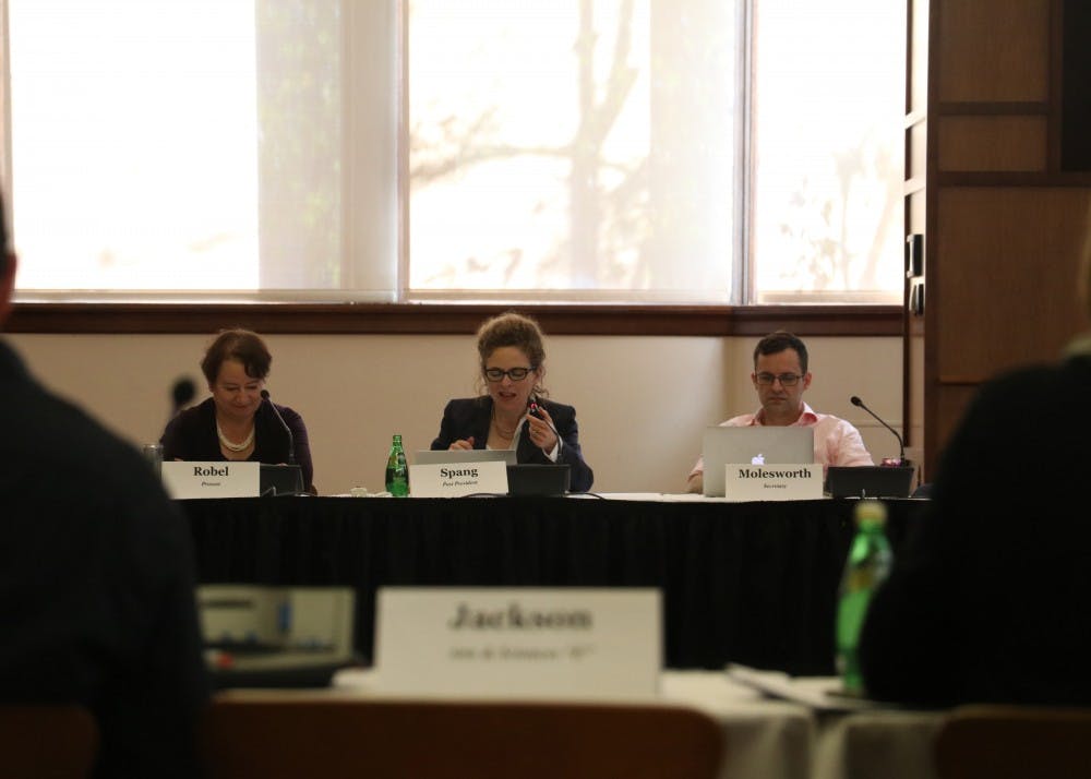 Bloomington Faculty Council Past-president Rebecca Spang speaks during an October BFC meeting. The BFC met Tuesday and focused on three main topics: a resolution in opposition to the taxation of tuition waivers, a discussion of the suspension of fraternities belonging to the Interfraternity Council and the passing of policy changes on aroyalty policy for instructor-developed classroom materials.