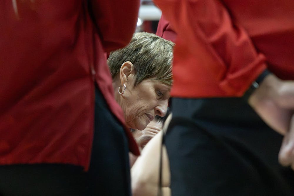 Head coach Teri Moren talks to the Indiana players during a timeout in the game against Oregon on Feb. 22, 2026, at Simon Skjodt Assembly Hall in Bloomington. Moren sometimes yelled at players from the sidelines during the game.