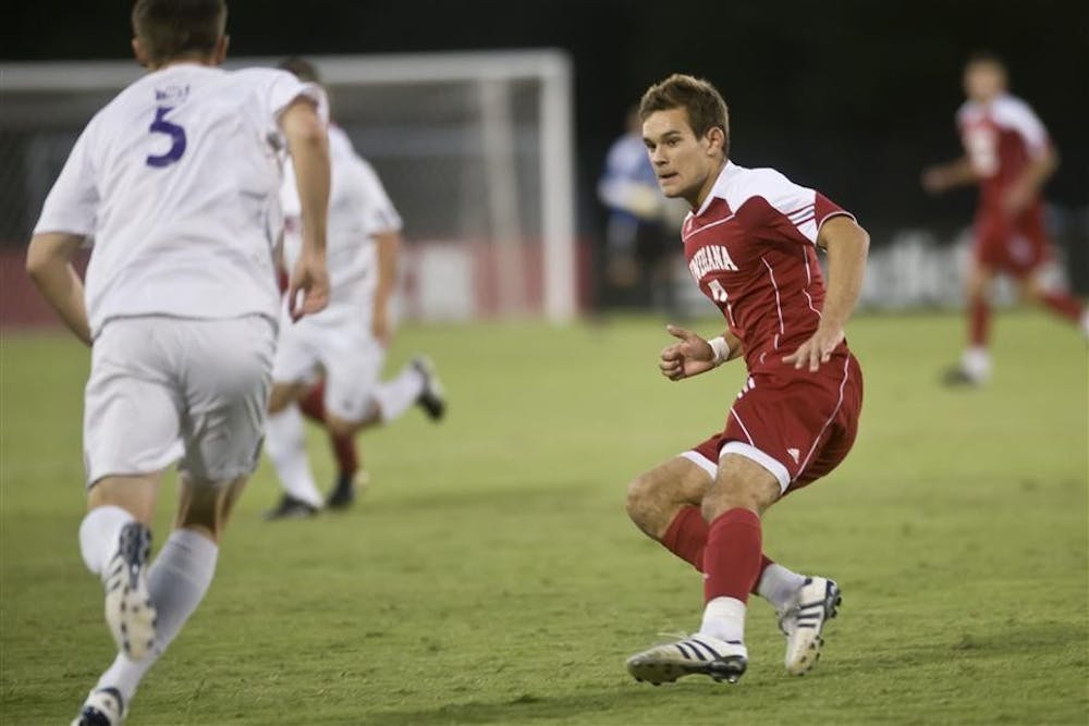 Freshman midfielder Harrison Petts closes down Evansville's Blake Schneider during IU's 1-0 win against the Purple Aces Wednesday at Bill Armstrong Stadium.