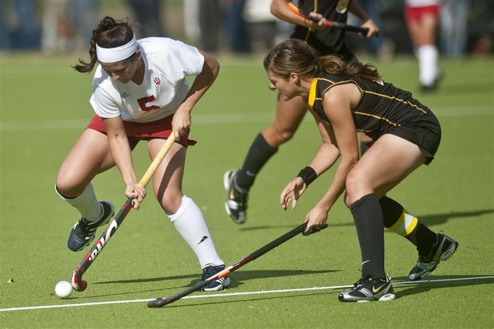 Senior forward Lena Grote dribbles during IU's 2-1 win against Iowa on Friday at the IU Field Hockey Field. Peter Stevenson
