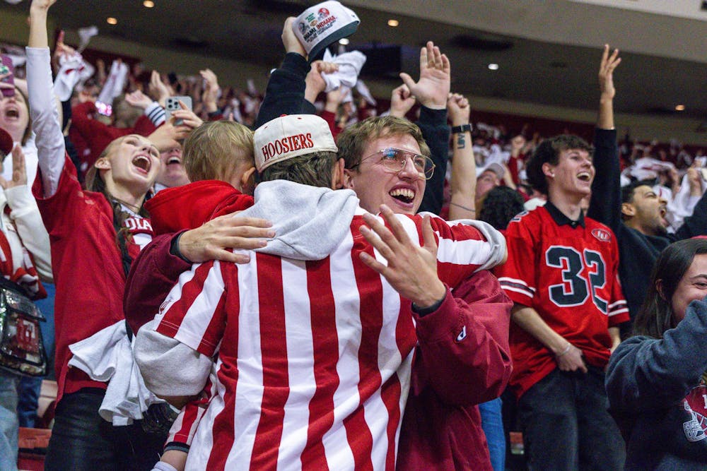 Indiana fans hug in celebration as the Hoosiers become the 2026 College Football National Champions on Jan. 19, 2026, in Simon Skjodt Assembly Hall in Bloomington. Assembly Hall was filled with fans, old and young, cheering on their team.