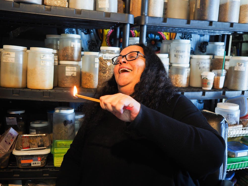 Mama Mo lights incense Feb. 7, 2026, at The Voodoo Shop at 920 N. Maple St. in Bloomington. She used the incense to bless the shop before opening for the day. Annabel Prokopy